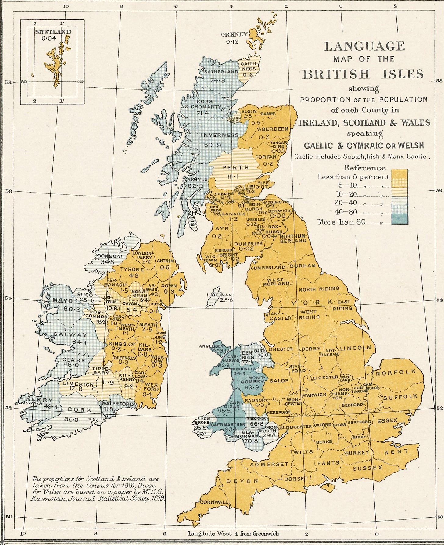 The estimated density of native Celtic languages in the year 1881, during dramatic declines.