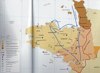 The Vikings created problems for the Bretons, as they did elsewhere. The Vikings attacked Nantes in 843 and began to settle around the margins of Brittany; they defeated Nomenoë in battle in 847. When Viking leader Rollo became the vassal of king of the West Franks in 911, the province of Normandy – directly to the north and east of Brittany – was formally granted to him as a fiefdom. The name “Normandy” reflects the dominance of the Norsemen in that region. Having the advantage of a land-base, they overran Brittany in 919 and established a Norse capital at Nantes in 921. It was probably these invasions that sent Breton leader Alain II “Barbetorte” into exile in England. He landed at Dol in 936 and spent the next three years expelling the Vikings from Brittany. Even though he was Duke of Brittany until his death in 952, he was unable to effectively unite the nobility of the country.