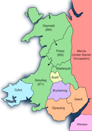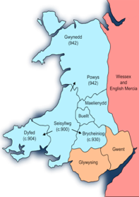 Although his son Anarawd inherited the kingdom of Gwynedd, he was not able to recreate his father’s degree of success. Anarawd’s nephew Hywel (c.880-950, the grandson of Rhodri Mawr), on the other hand, ruled nearly all of Wales during his reign and is referred to as “King of the Britons” by the Annales Cambriae and the Annals of Ulster. He came to the throne of Dyfed through his marriage to the heir at some unknown date; he inherited the throne of Seisyllwg in 911, ruling jointly with his brother Clydog until the latter died in 920. He created the kingdom of Deheubarth by uniting these two smaller kingdoms.