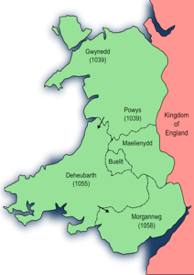 The greatest Welsh leader to emerge in this period was Gruffydd ap Llywelyn (c.1007-1063x4), the great-great-grandson of Hywel Dda and the son of the king of Gwynedd and Powys. Gruffydd seized control of his father’s kingdoms from its ruler, Iago ab Idwal, in 1039 and demonstrated a dogged resolution to remain free of English overlords. Shortly thereafter he defeated a Mercian army in a surprise attack at Battle of Rhyd y Groes and then went on to harass the neighbouring kingdom of Deheubarth. In 1055 he killed its leader, Gruffudd ap Rhydderch and took control of Deheubarth for himself. Soon thereafter he reclaimed Welsh territory east of Offa’s Dyke, and took over Morgannwg.