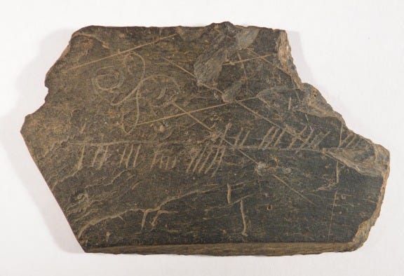 Some inscriptions recovered in excavations at the monastery of Inchmarnock on the Isle of Bute, Scotland, date to as early as the early 7th century. One particular slate tablet (see above), dating to c.750, contains Latin letters on one side and ogam letters on the other. The words in Latin – adeptus sanctum praemium “having reached the holy reward” – are an excerpt from the hymn “the Antiphony of Bangor,” likely composed in the late-7th century at Bangor Abbey in the north of Ireland. This rare piece of evidence indicates the kinds of texts in the curriculum in early medieval Gaelic Scotland, corroborates the close and direct connections between Ireland and Gaelic Scotland, and confirms that ogam was taught alongside Latin letters.