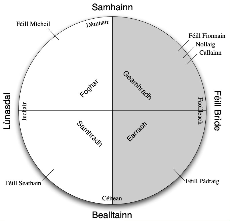 The Celtic calendar is not oriented around the solstice and equinox (as in the Roman and modern Christian) but the agricultural cycle. The date of Samain [CG] marks the end of the light half of the year and the beginning of the new year; this name (as the name of a month) appears on the Coligny Calendar from ancient G